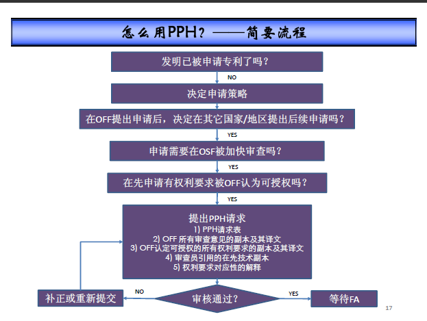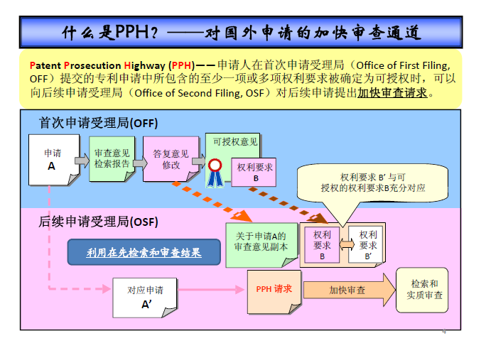 PPH是指申請人提交首次申請的專利局(OFF)認為該申請的至少一項或多項權利要求可授權,只要相關后續申請滿足一定條件,包括首次申請和后續申請的權利要求充分對應、OFF工作結果可被后續申請的專利局(OSF)獲得等,申請人即可以OFF的工作結果為基礎,請求OSF加快審查后續申請。
